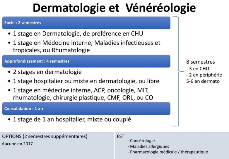 En pratique, à Lyon, les deux premiers semestres se font en dermatologie (1 à Lyon Sud et 1 en périphérie – Valence, Romans ou CLB).