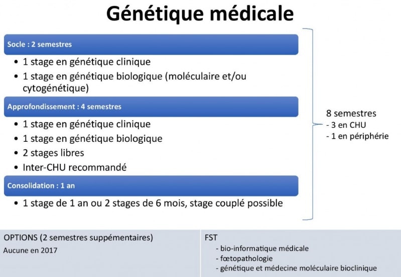 Les stages se choisissent très facilement entre internes de génétique, du fait du petit effectif. Les postes sont ouverts en fonction des demandes.