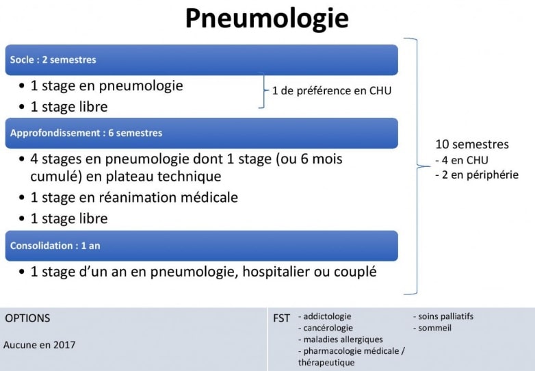 La durée totale de l’internat de pneumologie est depuis 2017 de 10 semestres, dont au moins 4 dans un CHU et au moins 2 sans encadrement universitaire. L’internat est divisé en 3 phases :